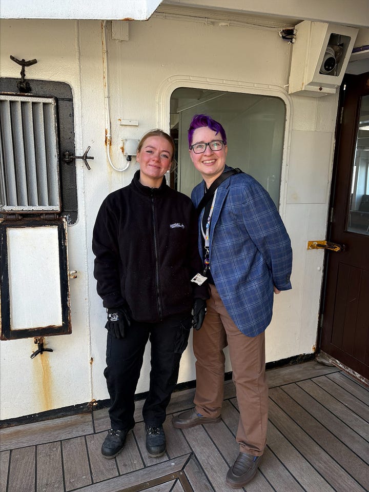 Over on the Ferry to the Wirral, we met Ellie Vondy, who is working towards becoming the first woman ever to captain the world‑famous Mersey Ferry. A qualified diver and marine biologist, she now splits her time between working onboard the ferry and studying part‑time at Fleetwood Marine College.